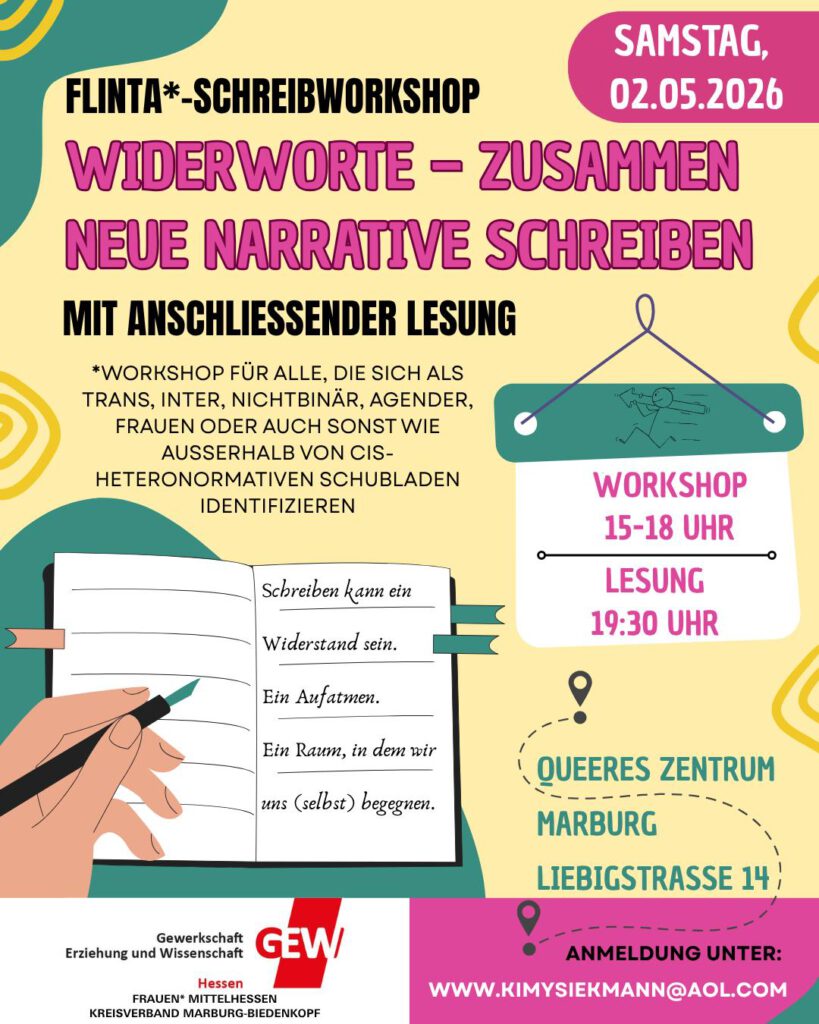 Workshop 15 – 18 Uhr Lesung um 19:30 Uhr im Queeren Zentrum Marburg, Liebigstraße 14
