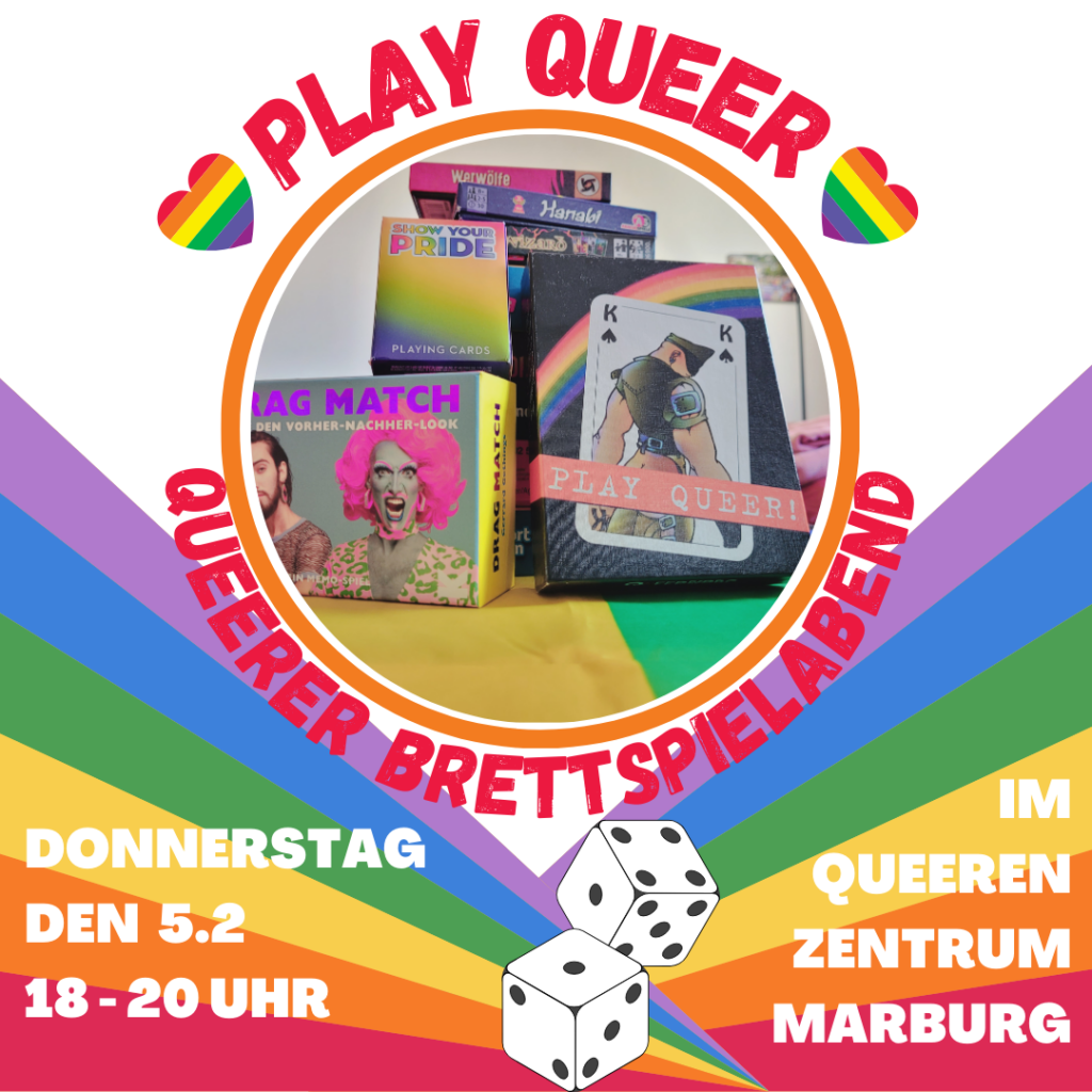 Diesen Donnerstag Abend ist es wieder soweit! Wir holen den Queeren Brettspielabend nach – also packt eure Lieblings Games ein und vertreibt euch mit uns von 18 – 20 Uhr einen gemütlichen Schnee schmelzenden Februarabend…❄⛅ Tee und Snacks gibts wie immer vor Ort!