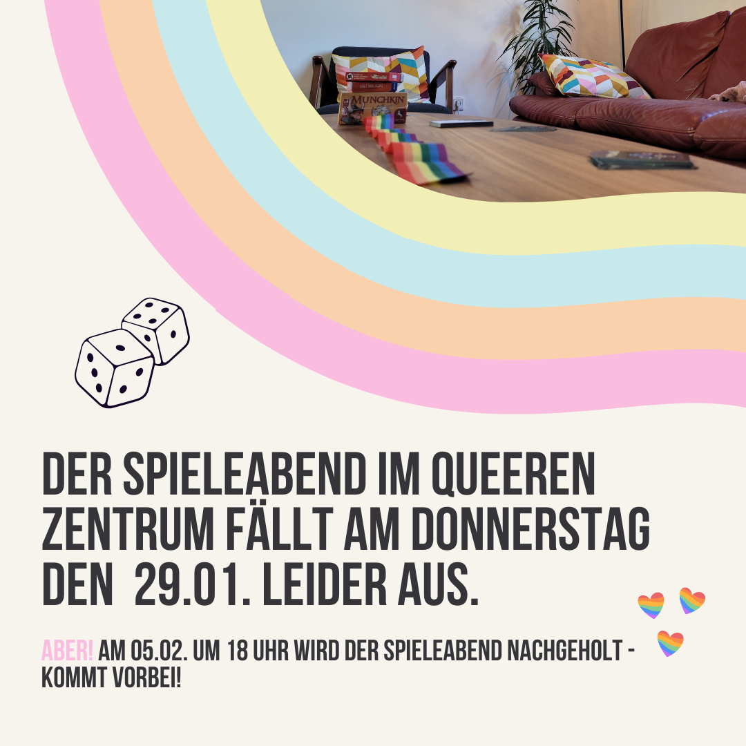 Liebe Queers, Der Spieleabend im Queeren Zentrum fällt am kommenden Donnerstag, den 29.01, leider aus. ABER: […]